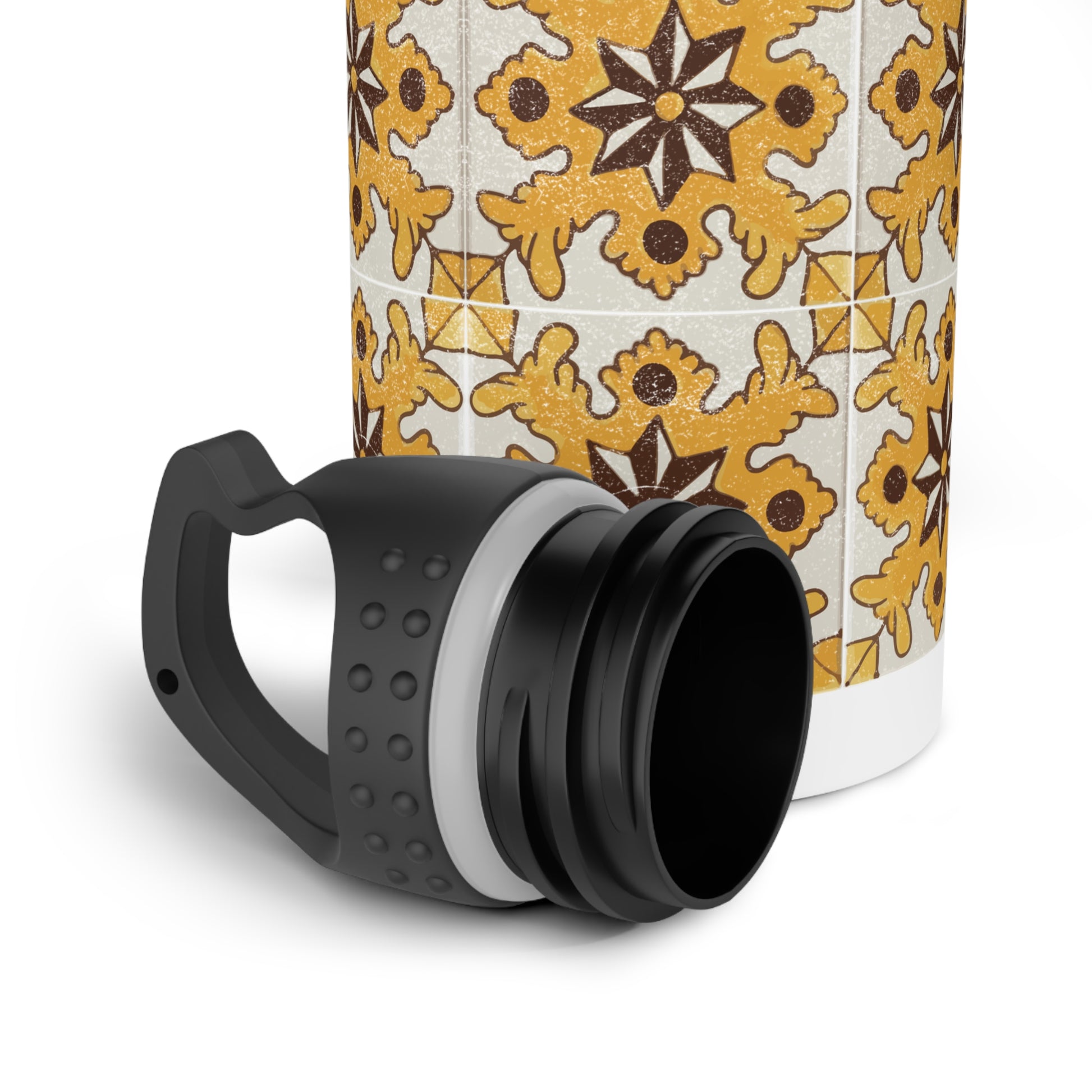 Cette bouteille d’eau en acier inoxydable de 20 oz porte un motif inspiré des carreaux vintage qui donne l’impression de trouver un coin frais et ensoleillé d’une vieille cour. L’imprimé brillant et enveloppant capte la lumière et fait ressortir les verts profonds et les ors chaleureux du motif répétitif. Léger et robuste, le col large facilite le remplissage, le versement et l’ajout de glaçons. Utilisez-le lors de longues promenades en ville, lors de sessions en studio ou glissé dans votre sac pour les marchés du week-end — il allie une utilisation quotidienne pratique à une esthétique silencieusement conçue qui vieillit bien.
